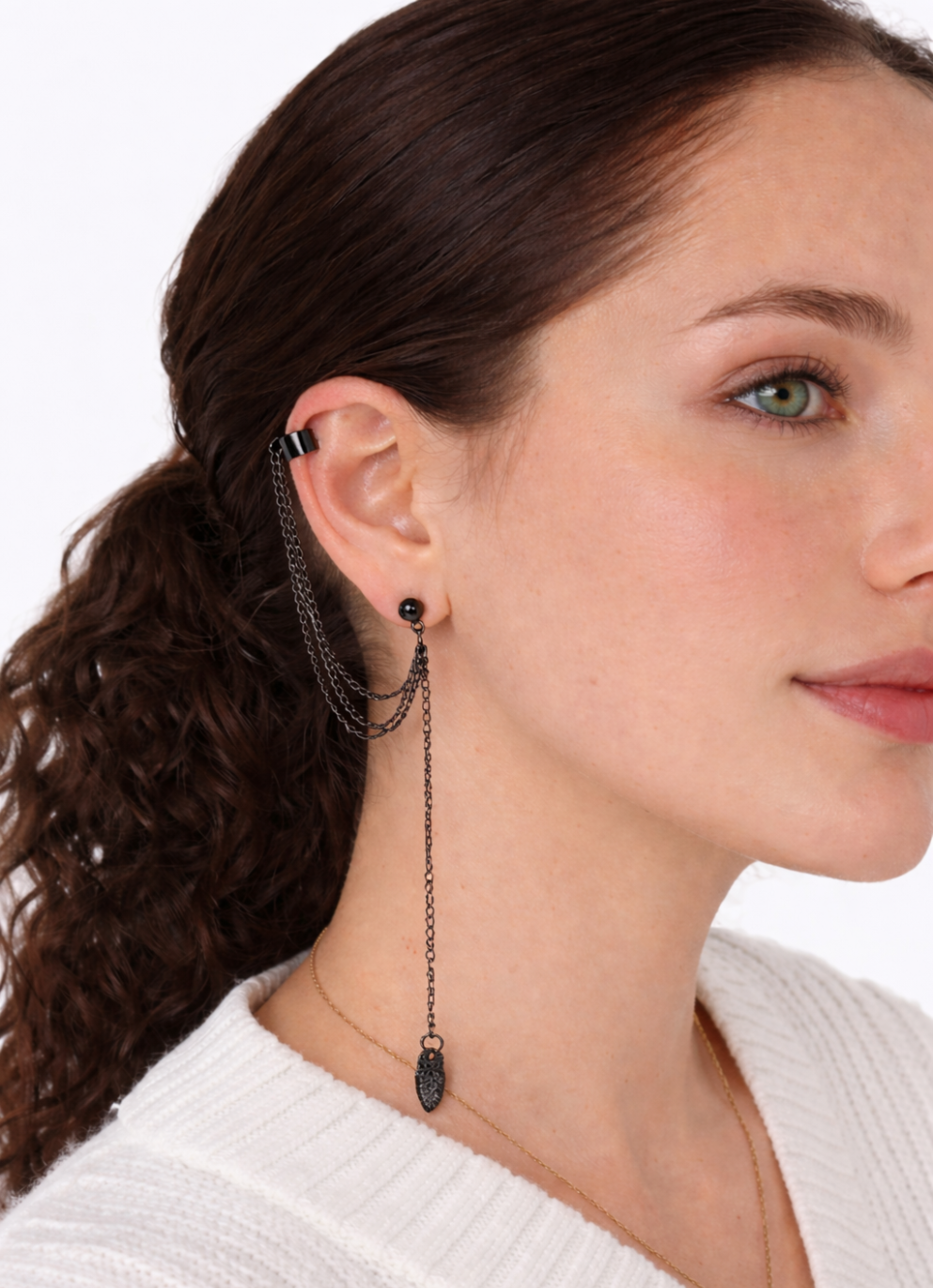 Pendientes ear cuff con cadena y detalle de hoja, pensados para destacar sin esfuerzo. Las cadenas conectan el lóbulo con la parte superior de la oreja sin la necesidad de perforaciones adicionales, creando un efecto único y poco común.